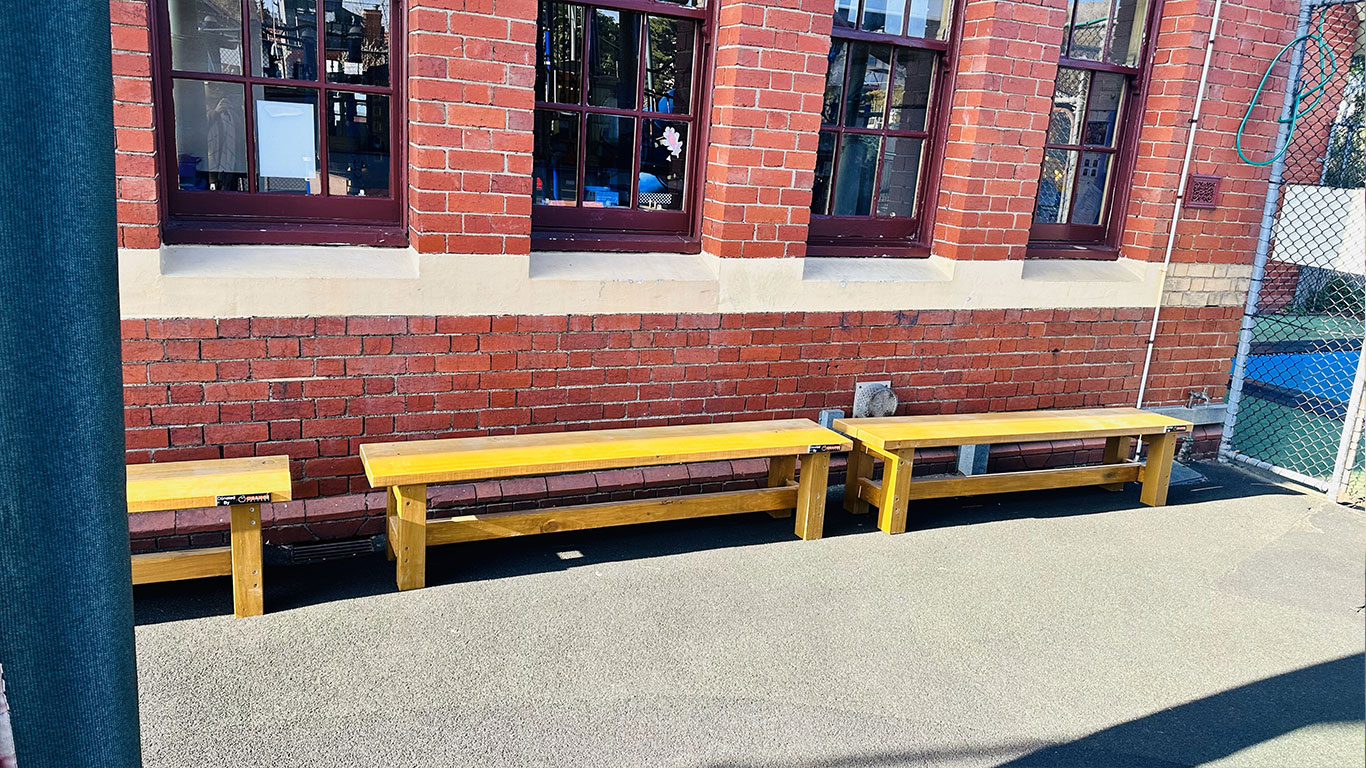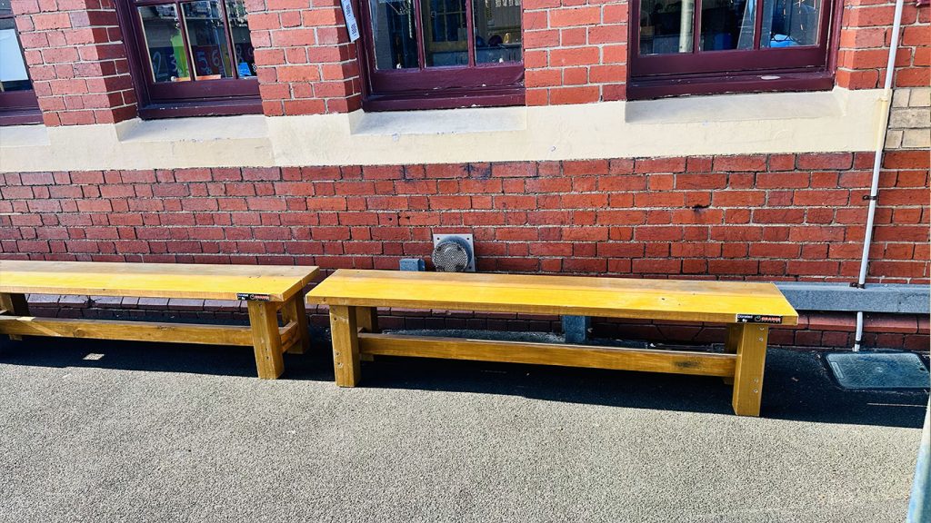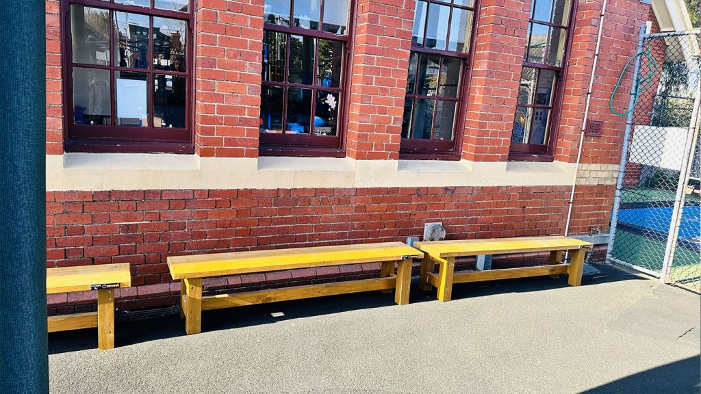 The benches at St Kilda Uniting Church have been refurbished as part of a student voluntary project. This effort reflects their dedication to enhancing the community space.