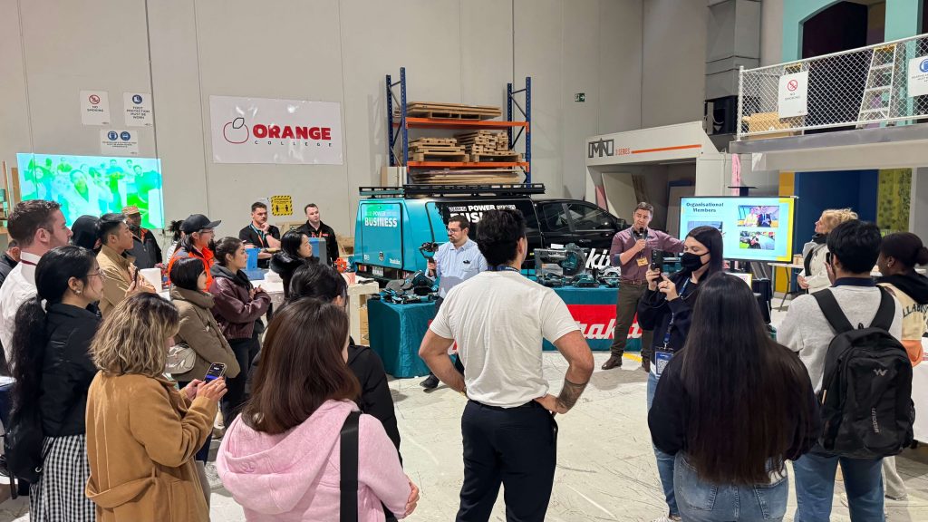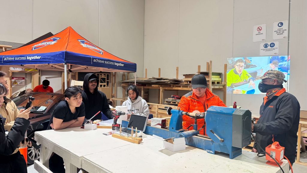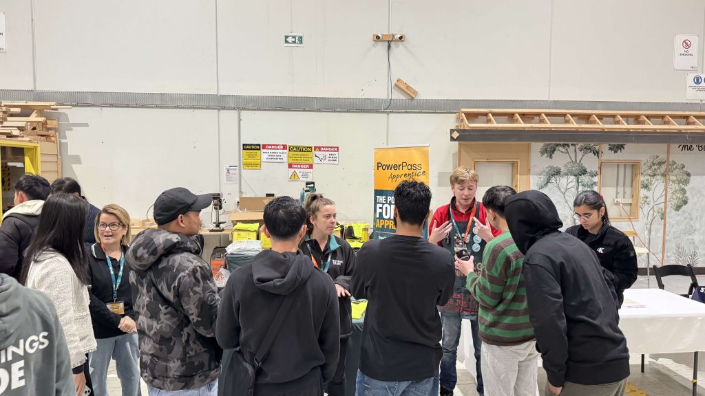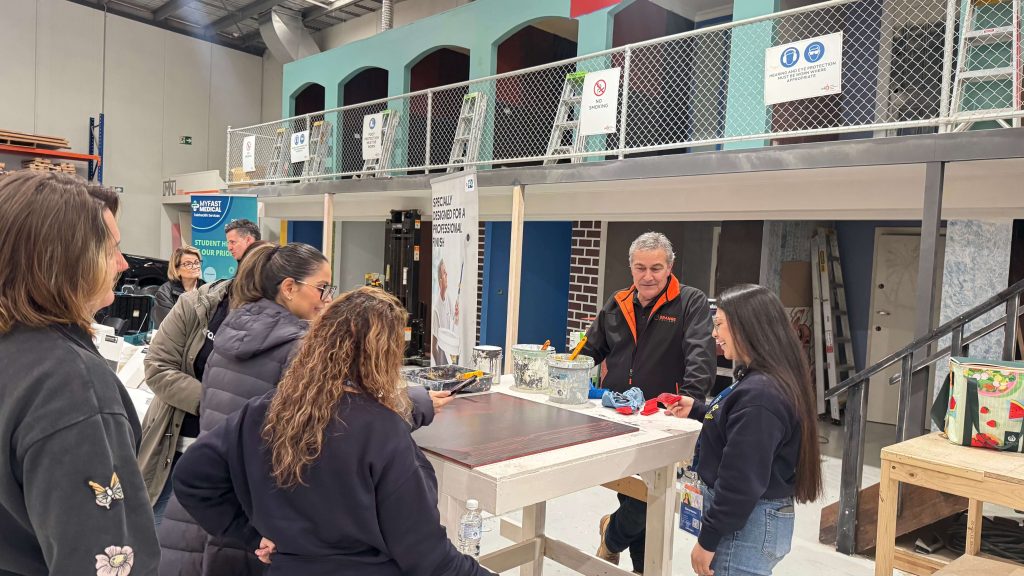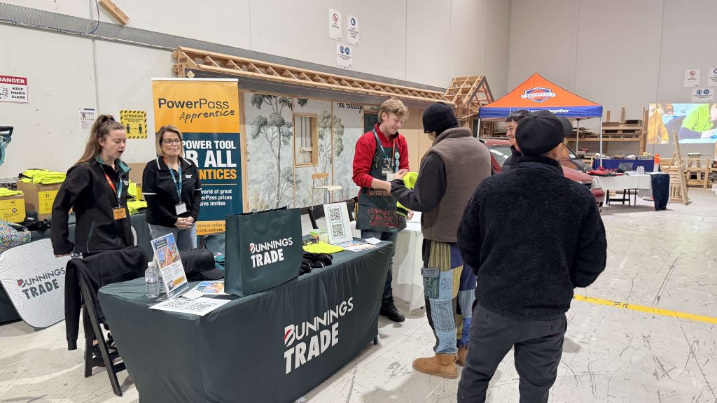 The event kicked off at 11:30 am with high energy as 11 industry vendors launched live demonstrations. Companies such as Paslode, Bunnings, Makita, Carpentry Australia, and Taubmans showcased their innovations while students moved between booths, engaging directly with professionals and experiencing trades firsthand.